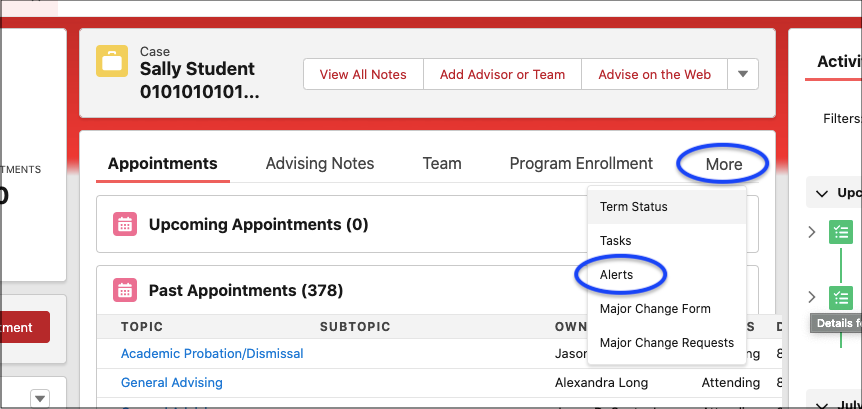 Navigate to Alerts from the "More" drop-down menu in a student's Advising Case as shown below.